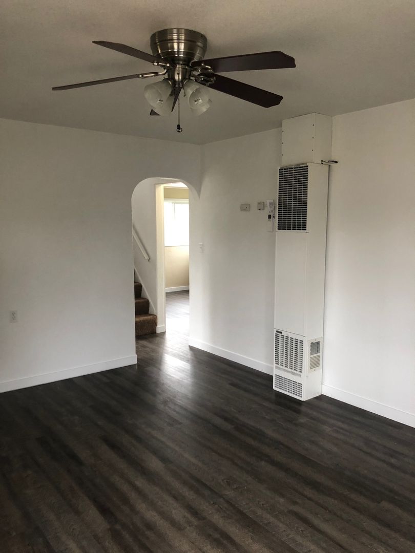 The house new plank flooring downstairs, energy efficient vinyl windows and A/C throughout the house. There is a private fenced back yard and an attached garage with washer/dryer hookups.